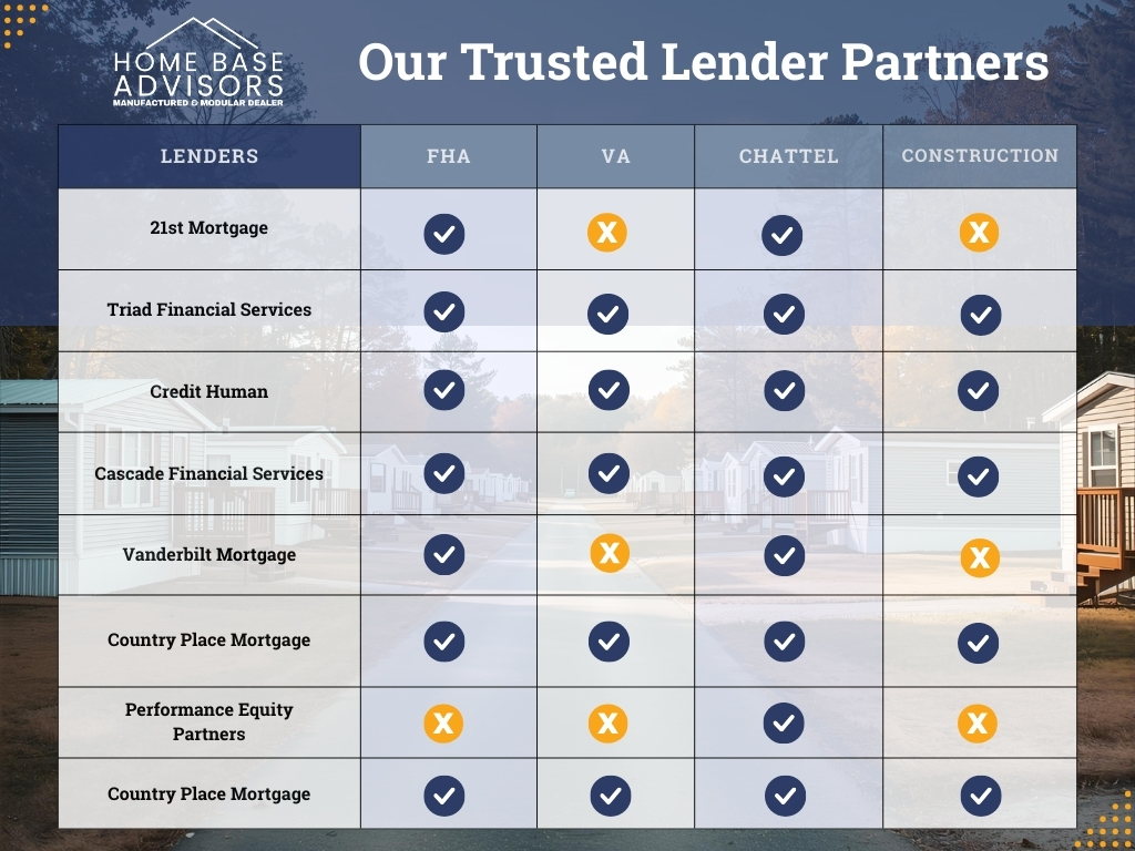 Once pre-approved, we’ll connect you directly with the lender that fits your needs - whether it’s FHA, VA, Chattel, or Construction financing.