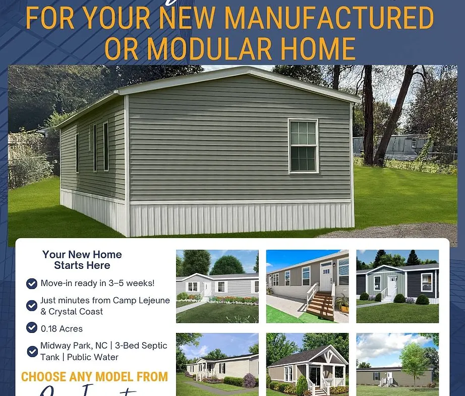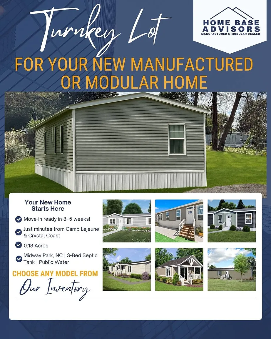 Discover modern comfort and style in this BRAND NEW 3 bedroom, 2 bath double wide manufactured home The Marvel by Tru, proudly offered by Home Base Advisors. With 1,475 sq. ft. of thoughtfully designed living space, this home blends luxury finishes with everyday functionality for the perfect balance of beauty and comfort. Set on a beautiful lot in Midway Park, NC, this home offers modern living in a highly convenient location just minutes from Camp Lejeune, Jacksonville, and the Crystal Coast beaches. Enjoy the perfect blend of peaceful neighborhood living and easy access to shopping, dining, schools, and recreation. Whether you’re stationed nearby or simply looking for a brand-new home close to the coast, this property delivers the ideal mix of comfort, style, and convenience. Fast Move-In Opportunity: This home will be ready for move-in within just 3-5 weeks – perfect for those eager to settle into a fresh, never-lived-in home without the long wait of traditional builds. Personalization Options: Customize your property with optional upgrades, including: -Underground electric -Decks and outdoor living spaces -Brick skirting for added curb appeal Like the land but want a different home? You can choose from any model in our inventory – explore all available homes at our website online.