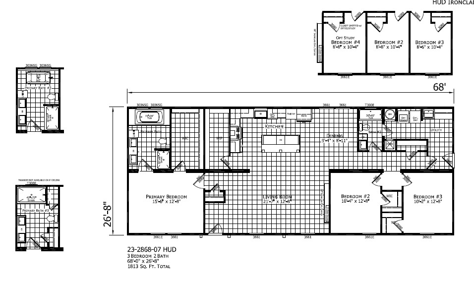 The Ironclad 2868-07 by Champion Homes offers 1,813 square feet of thoughtfully designed living space. This multi-section manufactured home features 3 bedrooms and 2 bathrooms, making it an ideal choice for families seeking comfort and style. Key options include a luxurious primary bath, an office/study, and a sliding glass door in the dining area.